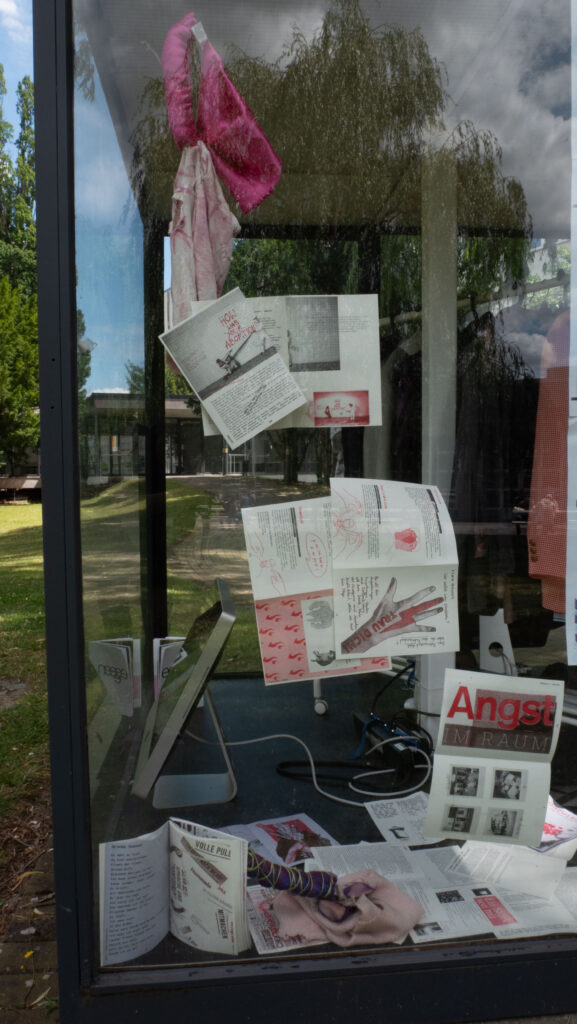 installation view on Zine-parts, costumes in a cube of glas at HBK brunswick